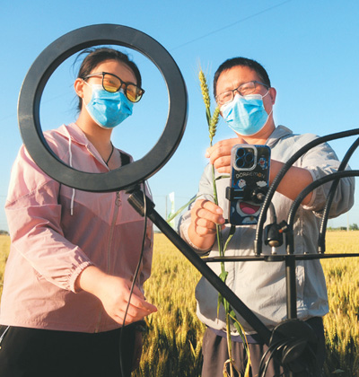 在山東省聊城市東昌府區(qū)閆寺街道周店村小麥良種繁育展示基地,負責技術(shù)的當?shù)厍嗄暝趯π←溒贩N進行直播推介。 |