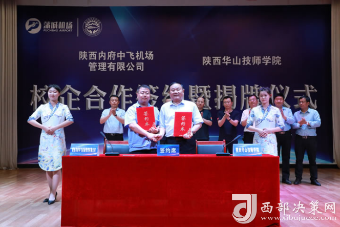 祝賀陜西內(nèi)府中飛機(jī)場(chǎng)管理有限公司總經(jīng)理魏鑫科與華山國(guó)際教育集團(tuán)董事長(zhǎng)任永敏簽約。