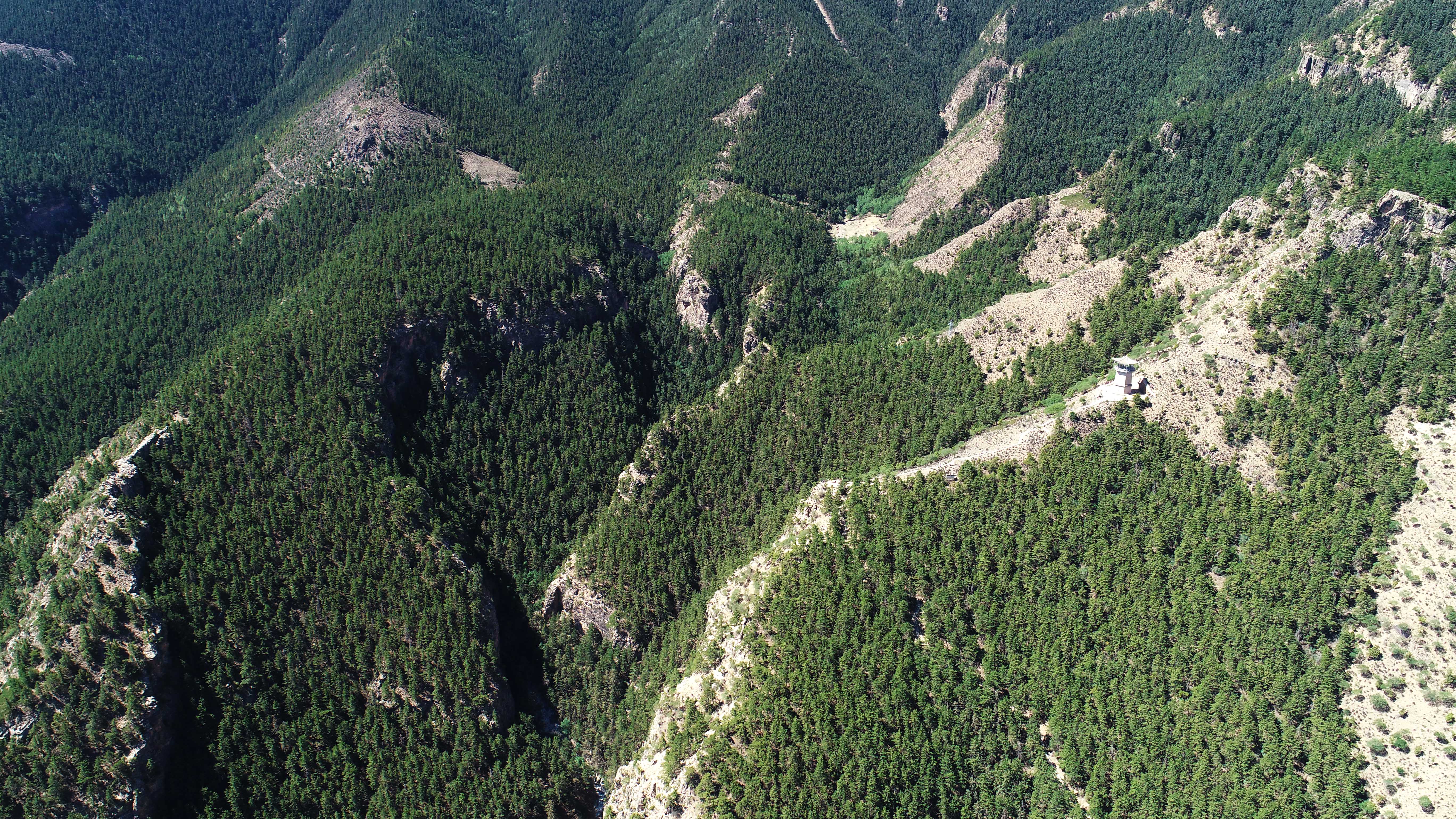 這是綠意盎然的賀蘭山蘇峪口國家森林公園(無人機照片,6月14日攝)。新華社記者王鵬攝