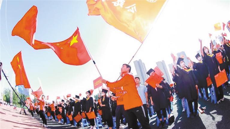長安大學畢業(yè)典禮上,同學們高舉五星紅旗。長安大學供圖