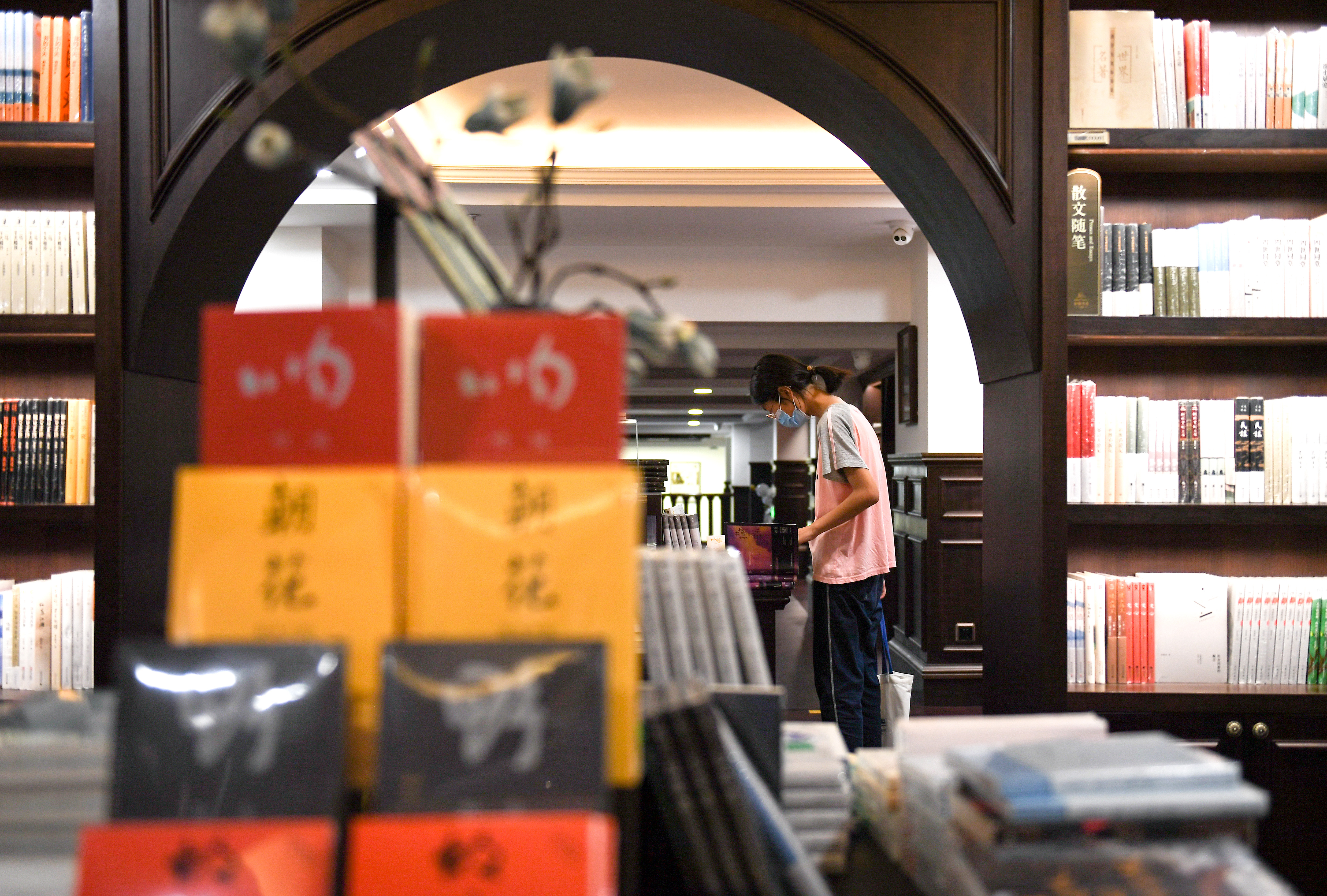 7月12日,西安市鐘樓附近一書店內(nèi),一名女孩在文學區(qū)書架前瀏覽。