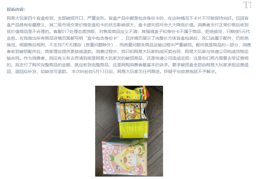 今年5月,在人民網(wǎng)“人民投訴”平臺上,一位網(wǎng)友“吐槽”了自己購買盲盒時(shí)遇到的“糟心事”,其表示自己在某平臺購買了盲盒玩具,收到時(shí)卻發(fā)現(xiàn)商品破損,但商家不同意更換,并故意拖延不予解決。
