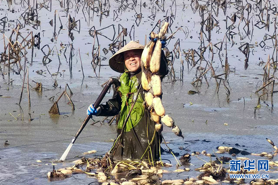 圖為藕農(nóng)在洪湖市雨錢蓮藕種植專業(yè)合作社的藕田搶抓農(nóng)時(shí)采挖蓮藕。新華網(wǎng)發(fā) 洪曉俊攝