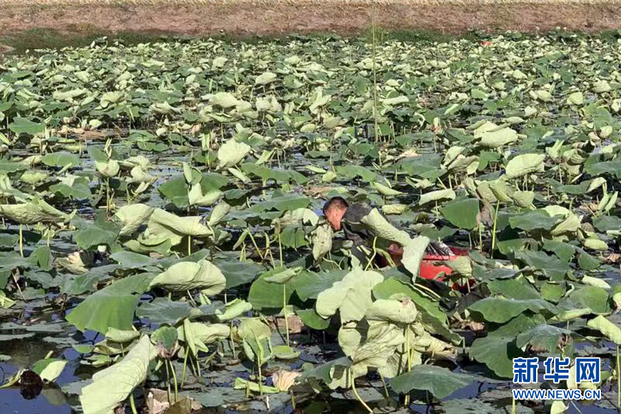 圖為洪湖市黃家口鎮(zhèn)新永林村的藕農(nóng)正在采收藕帶。新華網(wǎng)發(fā)(受訪者提供)
