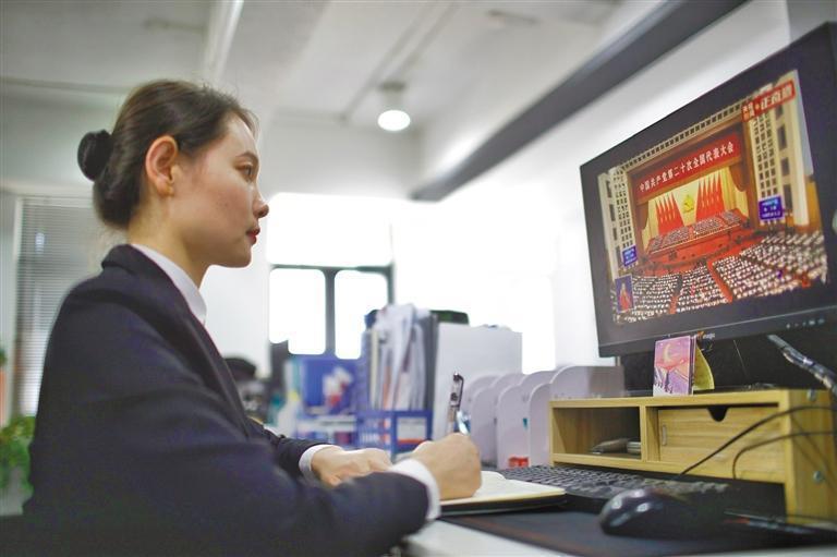 十月十六日,西安大唐不夜城景區(qū)工作人員龔飛飛在認(rèn)真收看黨的二十大開幕會。 記者 趙晨攝