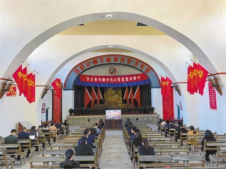 10月16日,延安革命紀(jì)念地管理局的40多名黨員干部職工在楊家?guī)X革命舊址中共七大會址集中收看黨的二十大開幕會。記者 陳宏江攝