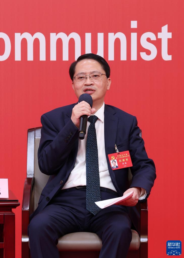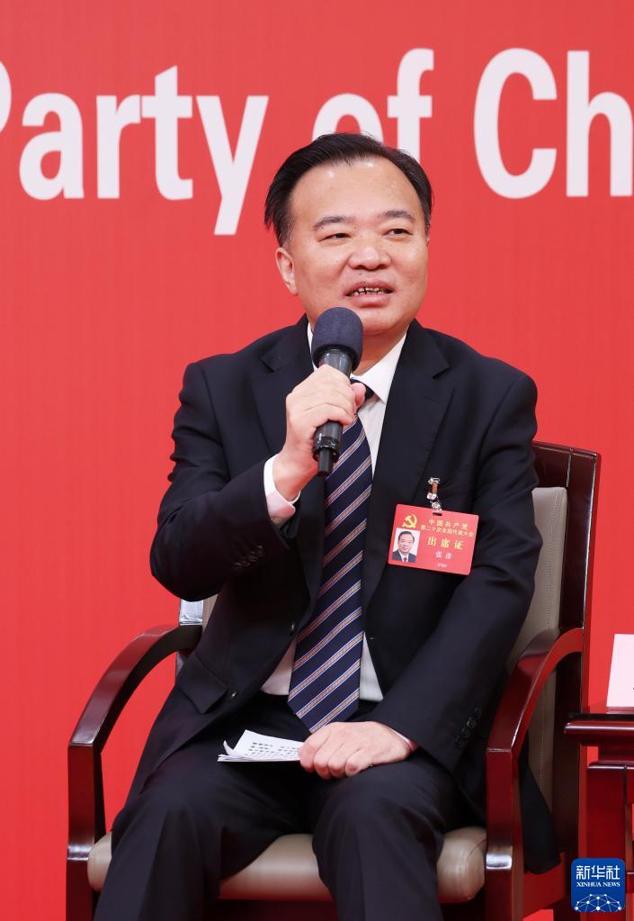 10月18日,中國共產(chǎn)黨第二十次全國代表大會新聞中心舉行集體采訪。黑龍江、上海、江蘇、浙江、安徽、福建、江西代表團(tuán)新聞發(fā)言人出席,介紹代表團(tuán)學(xué)習(xí)討論二十大報告情況,并回答記者提問。這是江西省委常委、宣傳部部長莊兆林在回答記者提問。新華社記者 張玉薇 攝