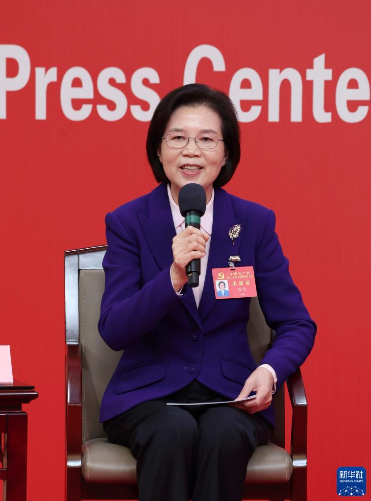 10月18日,中國共產(chǎn)黨第二十次全國代表大會新聞中心舉行集體采訪。黑龍江、上海、江蘇、浙江、安徽、福建、江西代表團(tuán)新聞發(fā)言人出席,介紹代表團(tuán)學(xué)習(xí)討論二十大報告情況,并回答記者提問。這是黑龍江省委常委、副省長,省政府黨組副書記沈瑩在回答記者提問。新華社記者 張玉薇 攝