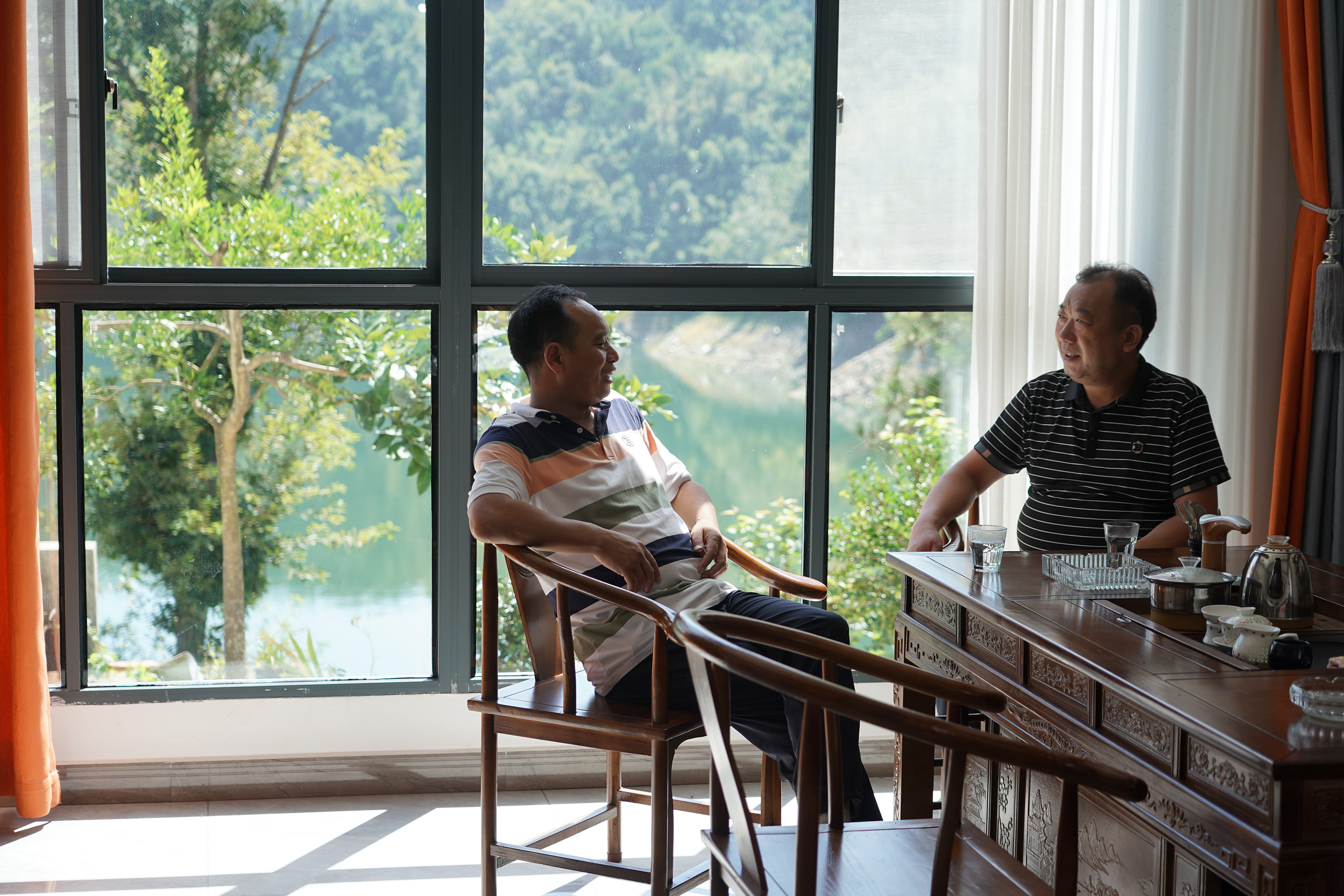 游客在安康市漢濱區(qū)漢江瀛湖邊的一家農家樂內休息聊天。(新華社記者 邵瑞 攝)