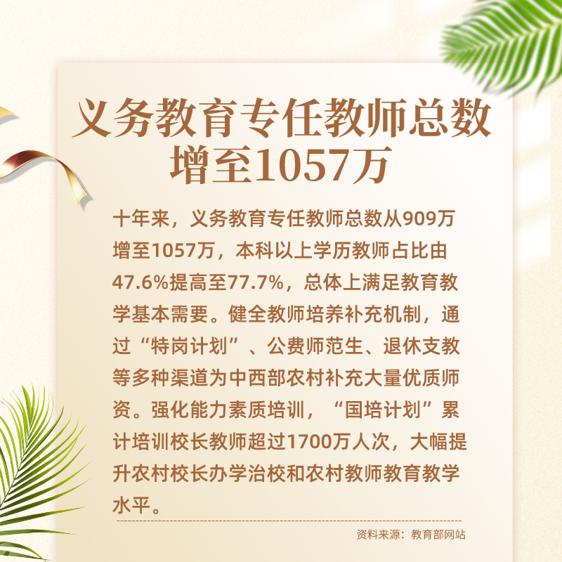 十年來,國家先后出臺多個高規(guī)格的重磅文件,各級黨委政府認(rèn)真落實(shí)中央要求,各級教育部門和中小學(xué)校積極作為,推動義務(wù)教育取得歷史性成就。尤其是這十年間,在全面普及的基礎(chǔ)上,實(shí)現(xiàn)縣域基本均衡發(fā)展,成為我國義務(wù)教育發(fā)展史上又一座重要的里程碑。