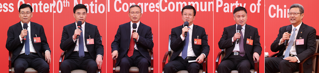 10月20日,中國共產(chǎn)黨第二十次全國代表大會新聞中心舉行集體采訪。青海、寧夏、新疆、中央和國家機(jī)關(guān)、中央金融系統(tǒng)、中央企業(yè)系統(tǒng)(在京)代表團(tuán)新聞發(fā)言人出席,介紹代表團(tuán)學(xué)習(xí)討論二十大報告情況,并回答記者提問(拼版照片)。新華社記者 張玉薇 攝