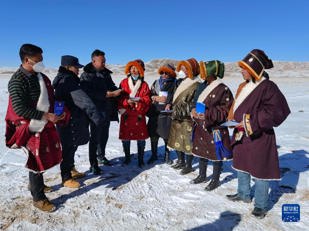 2021年12月20日,瑪多縣人民法院院長錢快乾(左一)給當?shù)啬羺^(qū)群眾宣講法律知識。新華社發(fā)