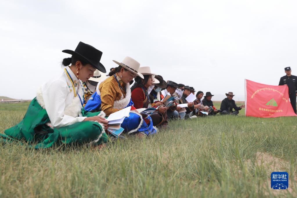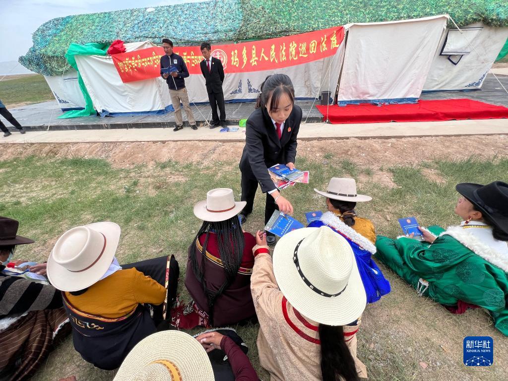 2022年7月12日,在瑪多縣冬格措納湖畔,當?shù)啬撩袢罕娫诼牞敹嗫h人民法院巡回法庭法律宣講。新華社發(fā)