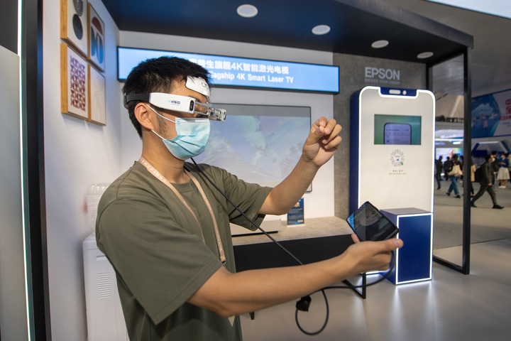 11月10日,觀眾在愛普生公司展臺(tái)體驗(yàn)AR感知交互眼鏡系統(tǒng)。新華社記者 江漢 攝