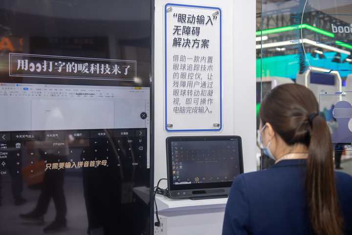 11月10日,觀眾在騰訊公司展臺(tái)體驗(yàn)“眼動(dòng)輸入”無障礙解決方案。新華社記者 江漢 攝