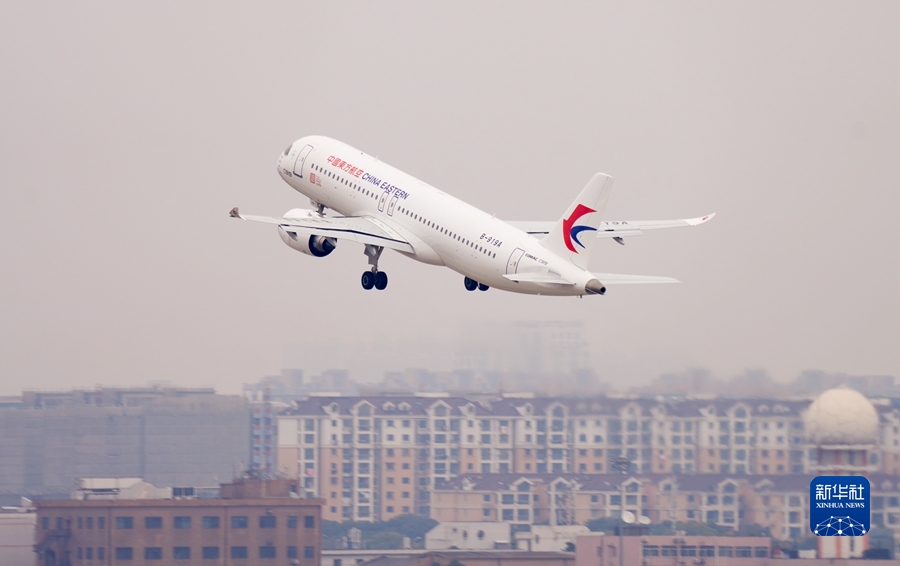 2022年12月26日,國產(chǎn)大飛機(jī)C919在上海虹橋國際機(jī)場起飛。 當(dāng)日,國產(chǎn)大飛機(jī)C919交付東航的全球首架機(jī)的首班驗(yàn)證飛行開啟,從上海虹橋國際機(jī)場飛往北京首都國際機(jī)場。 新華社發(fā)