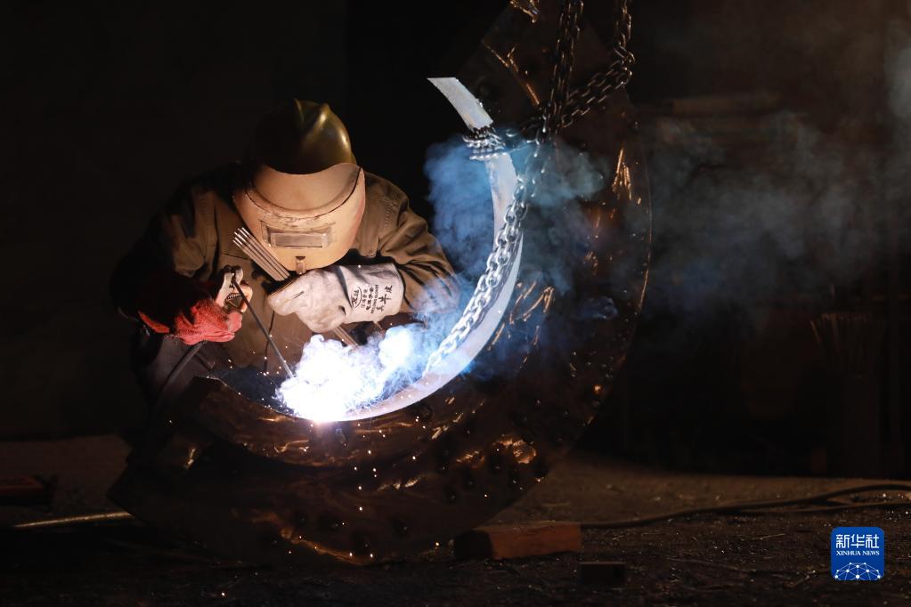 1月10日,在浙江省杭州市臨安區(qū)天目山鎮(zhèn)一家制造廠內(nèi),工人進(jìn)行焊接作業(yè)。新華社發(fā)(胡劍歡 攝)