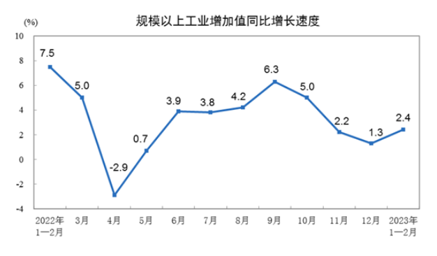 國家統(tǒng)計局3月15日發(fā)布數據顯示,今年前2個月,全國規(guī)模以上工業(yè)增加值同比增長2.4%,比2022年12月份加快1.1個百分點;兩年平均增長4.9%。