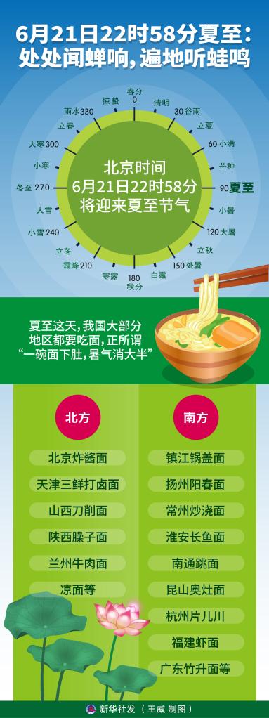 新華社天津6月20日電(記者周潤?。?ldquo;綠筠尚含粉,圓荷始散芳”。北京時間6月21日22時58分將迎來夏至節(jié)氣,標志著蛙鳴陣陣、蟬吟聲聲、荷韻飄香的盛夏來臨了。
