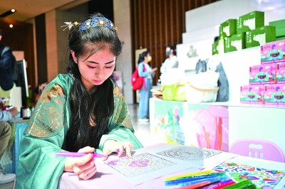 中國國家博物館內(nèi),觀眾在紙上進行文物紋樣涂鴉。新華社發(fā)