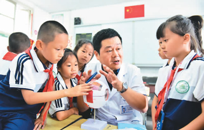 近日,在貴州省黔東南苗族侗族自治州從江縣城關(guān)第三小學,眼科醫(yī)生給學生講解健康用眼知識。石宏輝攝(人民視覺)