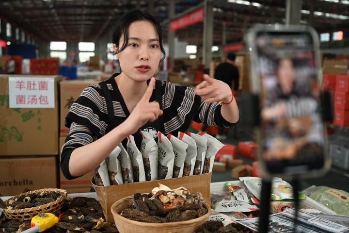 福建省寧德市近年來加大電商人才培育,推動鄉(xiāng)村振興和經(jīng)濟高質(zhì)量發(fā)展。圖為不久前的一處農(nóng)產(chǎn)品深精加工車間內(nèi),當(dāng)?shù)匾幻娚讨鞑フ诮榻B羊肚菌產(chǎn)品。新華社記者 林善傳攝