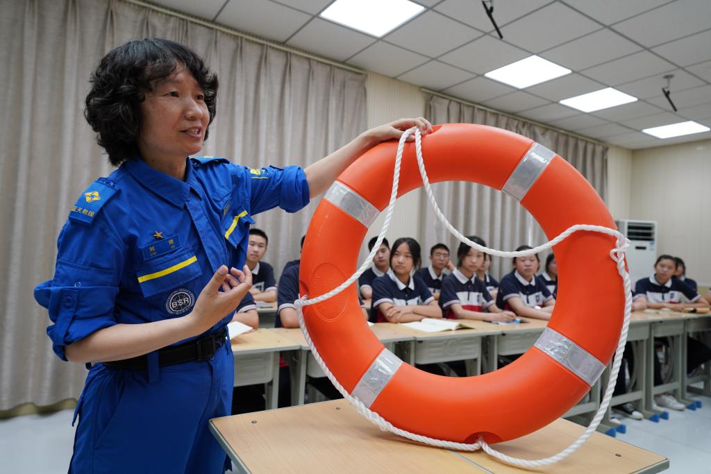 河北邢臺藍天救援隊志愿者指導邢臺市第八中學學生使用救生圈。 新華社記者駱學峰 攝