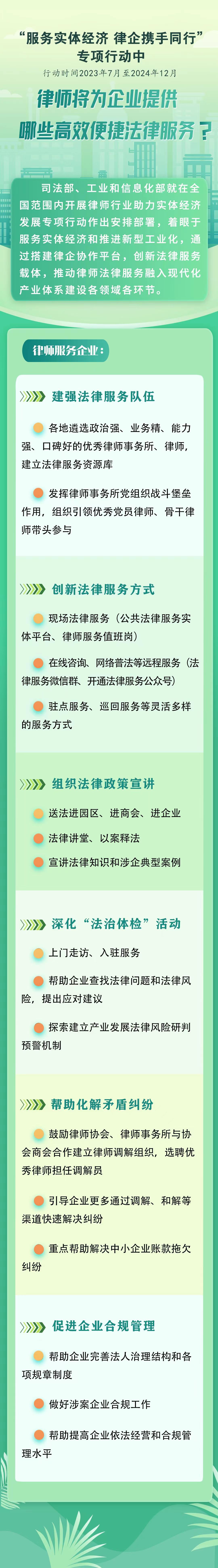 方案要求,各地司法行政部門、工業(yè)和信息化主管部門、通信管理局和律師協(xié)會(huì)要共同組織優(yōu)秀律師事務(wù)所和律師,為工業(yè)和信息化領(lǐng)域相關(guān)企業(yè)提供全業(yè)務(wù)、全時(shí)空、高效便捷的法律服務(wù)。活動(dòng)中,要摸清各類企業(yè)法律服務(wù)需求,建強(qiáng)法律服務(wù)隊(duì)伍,創(chuàng)新法律服務(wù)方式,通過開展法律政策宣講、深化“法治體檢”活動(dòng)等形式,推動(dòng)律師行業(yè)服務(wù)實(shí)體經(jīng)濟(jì)的廣度和深度不斷拓展,服務(wù)的專業(yè)性、精準(zhǔn)性、便捷性、實(shí)效性不斷增強(qiáng),幫助企業(yè)化解法律風(fēng)險(xiǎn),解決法律問題,維護(hù)合法權(quán)益,提升依法合規(guī)經(jīng)營管理水平。