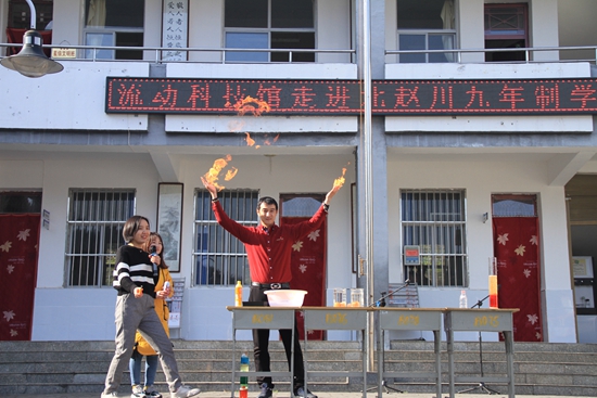 付佳樂與指導教師一起為丹鳳縣武關鎮(zhèn)北趙川九年制學校展示趣味科學實驗。受訪者供圖