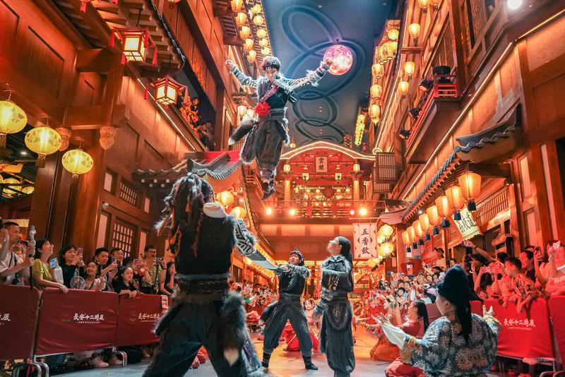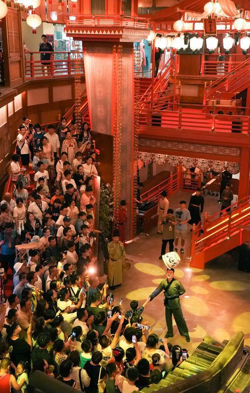 新增節(jié)目《萬(wàn)邦來(lái)朝》包含胡旋舞、走秀、雜技等表演,熱鬧非凡。圖為演員表演雜技。