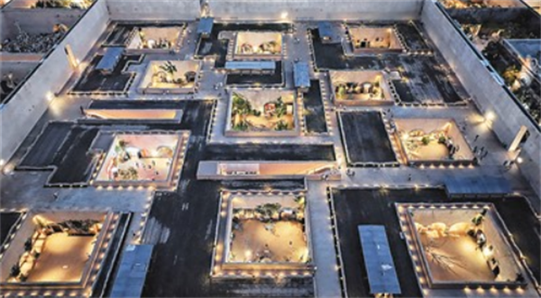 這座“戲劇幻城”從盲盒中創(chuàng)意取材,用夯土城墻合圍出方正的空間,并劃分出56個完全不同的格子,打造了21個劇場和不同風格的景觀院落。游客可以在格子中穿行,分別進入不同時期、不同主題的戲劇空間觀演。置身其中,在LED光影技術(shù)、“聲光電畫”一體化數(shù)控系統(tǒng)的輔助下,游客可以回到紅廟學校,重溫童年時的課堂時光;“穿越”到1942年,體驗李家村人逃荒的艱辛;來到“天子駕六遺址坑”與想要預見未來的周天子進行“時空對話”……
