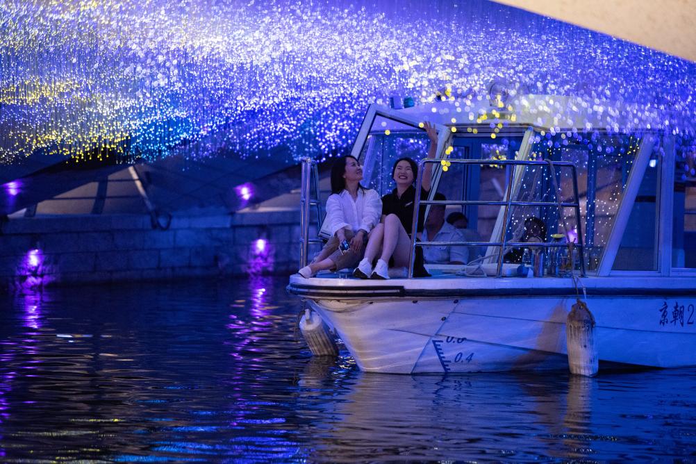這是人們乘坐北京亮馬河游船經過被裝點成“星空”的好運橋。 新華社記者 陳鐘昊 攝