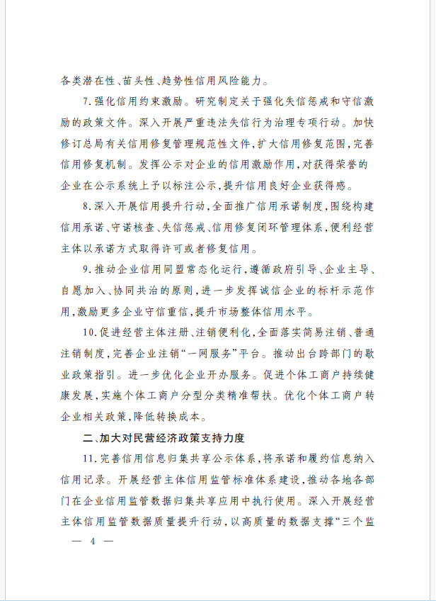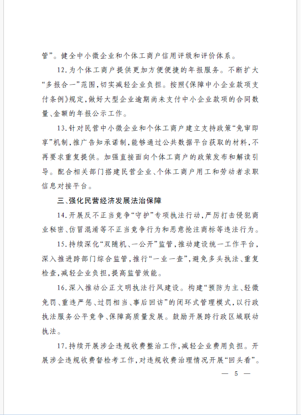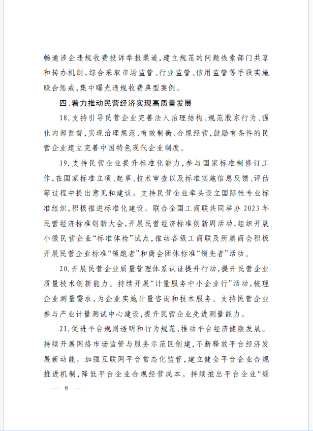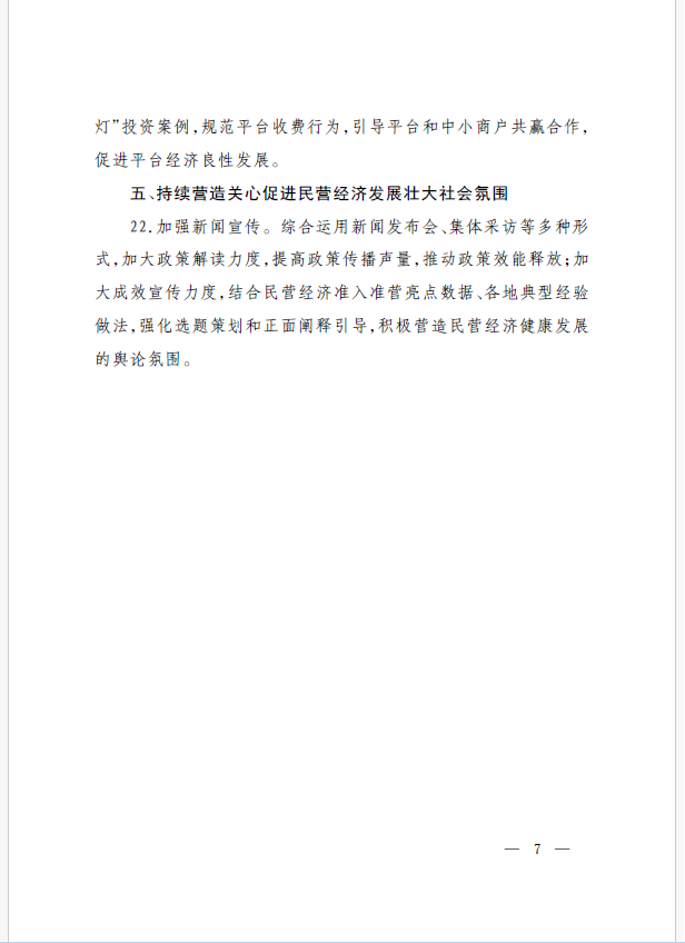 22條舉措聚焦五個(gè)方面,落實(shí)《意見》部署要求,回應(yīng)了民營經(jīng)濟(jì)各類關(guān)切:一是持續(xù)優(yōu)化民營經(jīng)濟(jì)發(fā)展環(huán)境。持續(xù)破除市場準(zhǔn)入壁壘,全面落實(shí)公平競爭政策制度,強(qiáng)化制止濫用行政權(quán)力排除、限制競爭的反壟斷執(zhí)法,完善社會(huì)信用激勵(lì)約束機(jī)制,健全失信行為糾正后的信用修復(fù)機(jī)制。二是加大對民營經(jīng)濟(jì)政策支持力度。完善信用信息歸集共享,健全中小微企業(yè)和個(gè)體工商戶信用評級(jí)和評價(jià)體系。完善支持政策直達(dá)快享機(jī)制。三是強(qiáng)化民營經(jīng)濟(jì)發(fā)展法治保障。持續(xù)完善知識(shí)產(chǎn)權(quán)保護(hù)體系,完善監(jiān)管執(zhí)法體系,杜絕選擇性執(zhí)法,健全涉企收費(fèi)長效監(jiān)管機(jī)制。四是著力推動(dòng)民營經(jīng)濟(jì)實(shí)現(xiàn)高質(zhì)量發(fā)展。支持民營企業(yè)參與標(biāo)準(zhǔn)制定,計(jì)量服務(wù)中小企業(yè)。依法規(guī)范和引導(dǎo)民營資本健康發(fā)展,推動(dòng)平臺(tái)經(jīng)濟(jì)健康發(fā)展。五是持續(xù)營造關(guān)心促進(jìn)民營經(jīng)濟(jì)發(fā)展壯大社會(huì)氛圍,及時(shí)推廣經(jīng)驗(yàn)做法,加大宣傳。