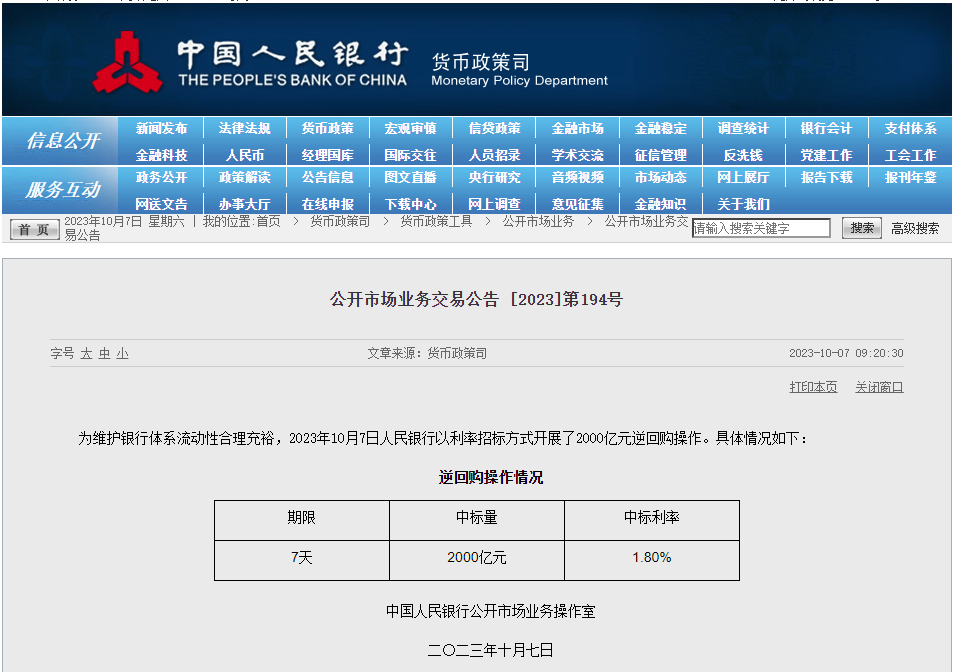 據(jù)中國人民銀行網(wǎng)站公告,10月7日,央行以利率招標方式開展2000億元逆回購操作,期限為7天,中標利率為1.80%,與此前持平。