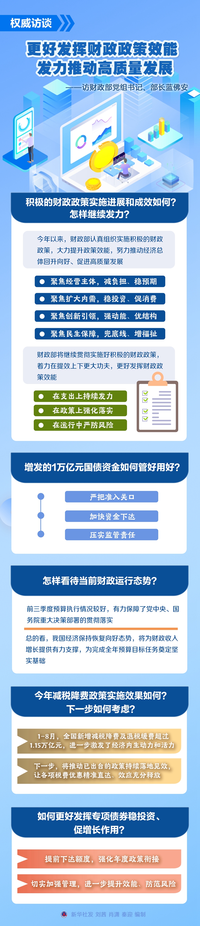 財(cái)政政策是國家宏觀調(diào)控的重要手段。下一步,財(cái)政政策還將如何發(fā)力?增發(fā)的國債怎樣用好?財(cái)政運(yùn)行態(tài)勢如何?新華社記者采訪了財(cái)政部黨組書記、部長藍(lán)佛安。