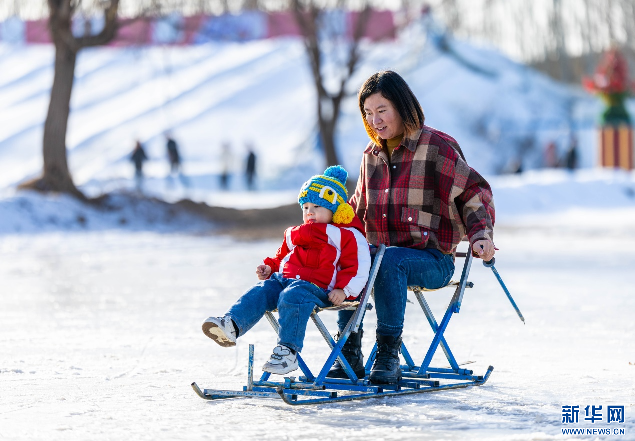 12月7日,家長陪伴孩子在呼和浩特市玉泉區(qū)大庫倫村“冰雪大世界”內(nèi)體驗滑冰車。新華網(wǎng)發(fā)(丁根厚 攝)