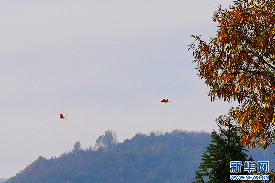 冬日,在石泉縣城關鎮(zhèn)絲銀壩村草池灣,2只朱鹮自由翱翔。新華網(wǎng) 楊喜龍 攝