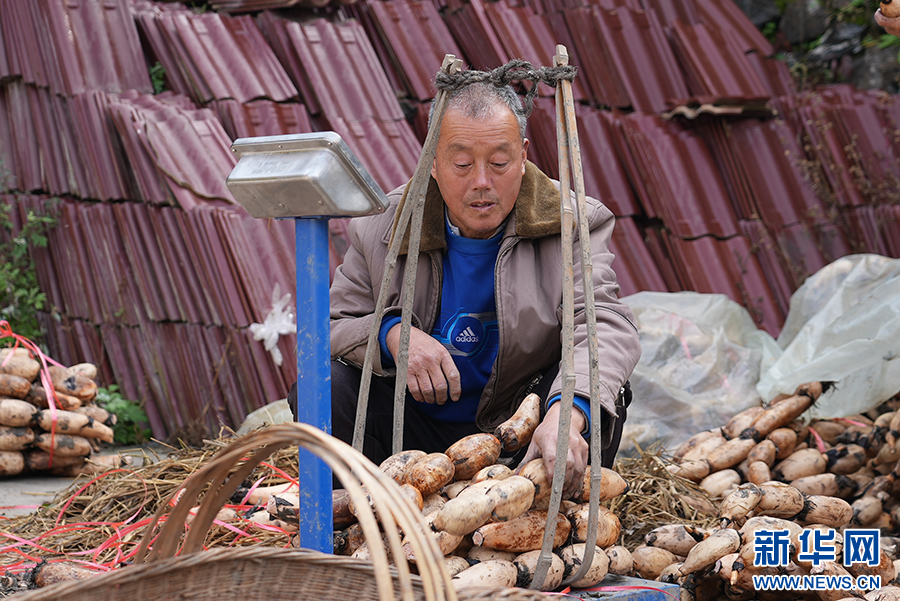 冬日,在石泉縣城關鎮(zhèn)絲銀壩村草池灣一處農(nóng)家小院里,一位老者捆扎蓮藕。新華網(wǎng) 楊喜龍 攝
