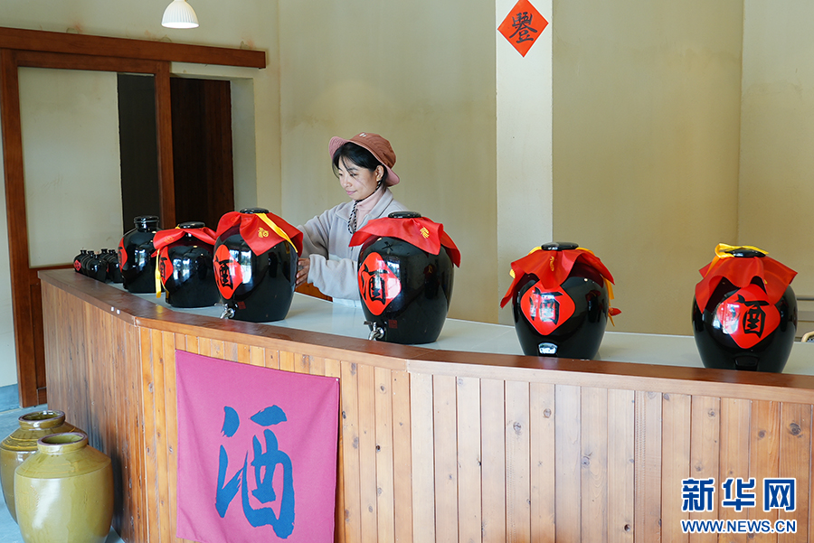 冬日,在石泉縣城關鎮(zhèn)絲銀壩村草池灣米酒工坊,工作人員整理柜臺。新華網(wǎng) 楊喜龍 攝