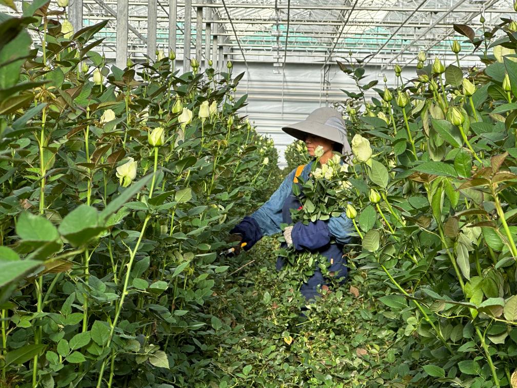 脫去厚重的外套,張小紅換上輕便的工作服,戴好手套和帽子,拿起大剪刀,開始了一天的剪花工作。只見她走進(jìn)幽深窄密的綠色長廊,直到看不見人影。少許時(shí)刻,她便抱著一大捧玫瑰走了出來,新鮮的露水從嬌嫩的花瓣上滴落。平板車?yán)锸M清水,她和其他工人們一起,將新鮮采摘的玫瑰用網(wǎng)紗細(xì)心地裹好,然后放置水中。再過不久,這些玫瑰將被運(yùn)往全國各地甚至海外,為人們帶來愉悅和享受。