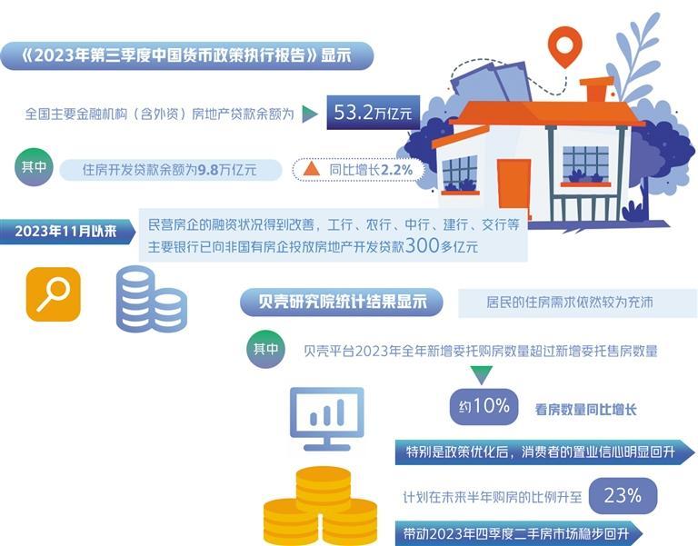 從銀行信貸角度看,房地產(chǎn)信貸融資的規(guī)模、結(jié)構(gòu)整體穩(wěn)定?!?023年第三季度中國貨幣政策執(zhí)行報(bào)告》顯示,全國主要金融機(jī)構(gòu)(含外資)房地產(chǎn)貸款余額為53.2萬億元,其中,住房開發(fā)貸款余額為9.8萬億元,同比增長(zhǎng)2.2%。2023年11月以來,民營房企的融資狀況得到改善,工行、農(nóng)行、中行、建行、交行等主要銀行已向非國有房企投放房地產(chǎn)開發(fā)貸款300多億元。