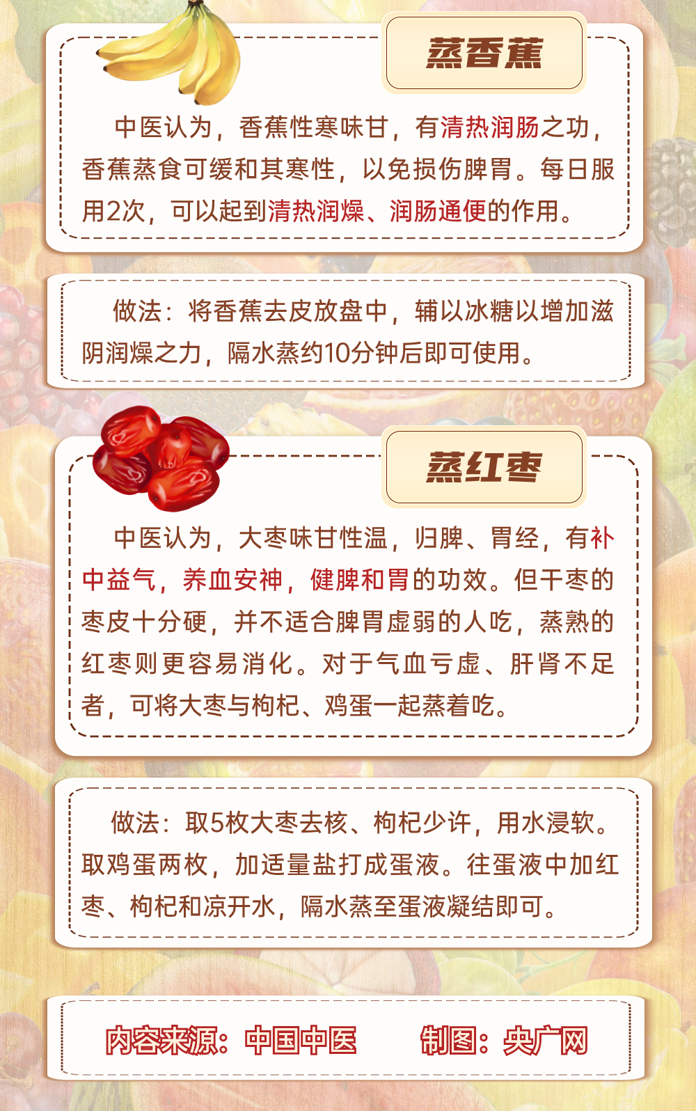 那么,應(yīng)該怎樣蒸水果呢?不同水果蒸著吃,對健康有哪些好處呢?請收好這份蒸水果食譜。(記者 雷妍 實習(xí)記者 王佳路)