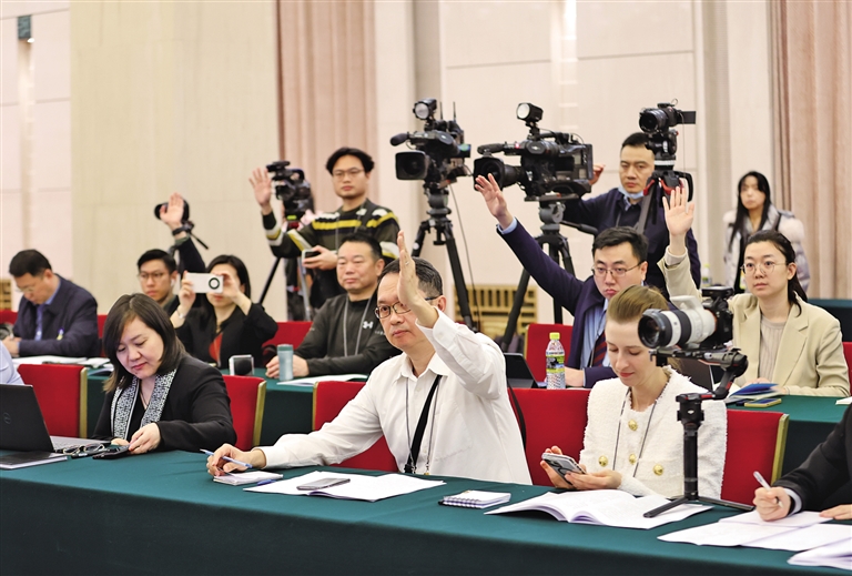 三月六日,中外媒體記者走進(jìn)北京人民大會堂,參加十四屆全國人大二次會議陜西代表團(tuán)媒體開放日活動。圖為記者舉手爭取提問機(jī)會。 記者 母家亮攝