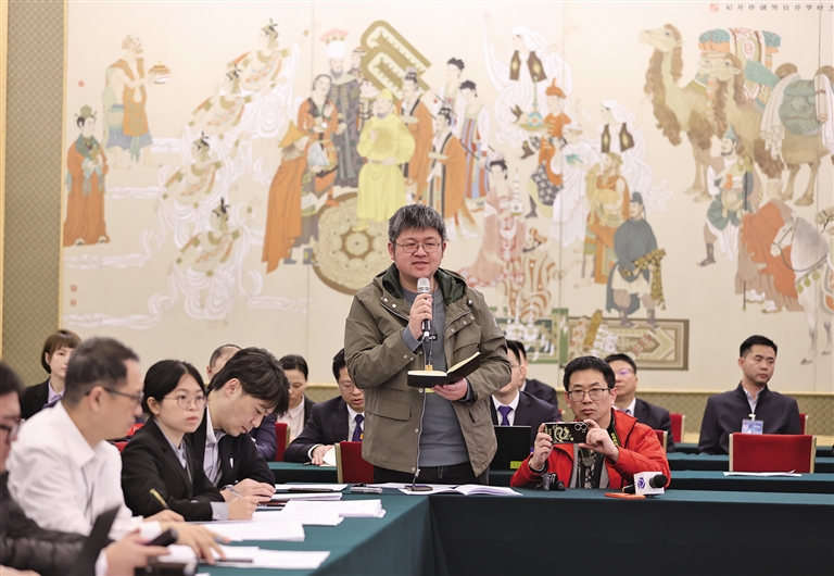 3月6日,中外媒體記者走進(jìn)北京人民大會堂,參加十四屆全國人大二次會議陜西代表團(tuán)媒體開放日活動。圖為記者向代表提問。記者 母家亮攝