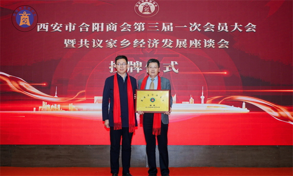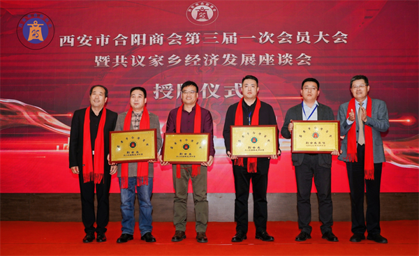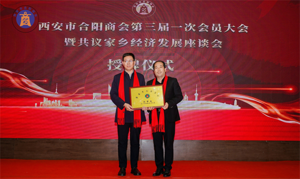 西安市合陽商會會長賈申龍先生和監(jiān)事長劉自力先生為副會長單位授牌。