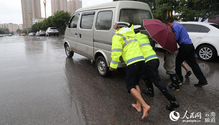 市民抓拍!云南昭通“赤腳交警”冒雨幫市民推車(chē)